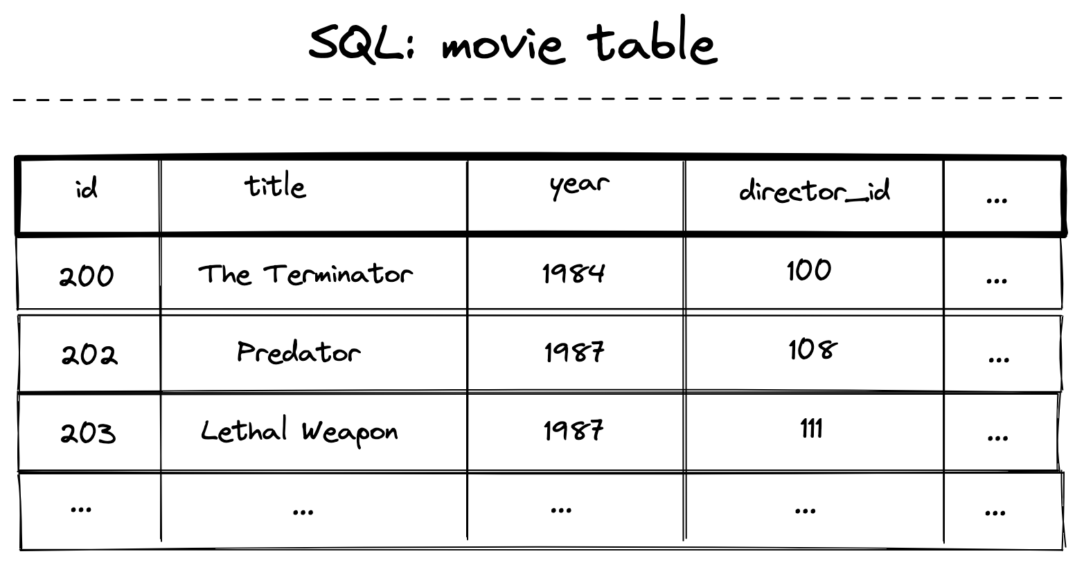 In SQL, if we wanted to find “The Terminator’s” director, we could write: